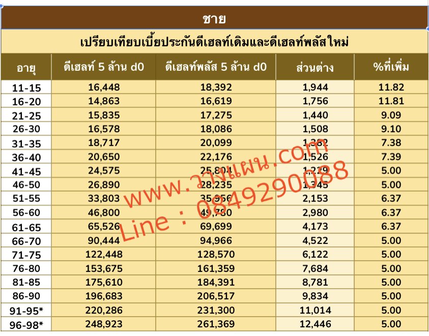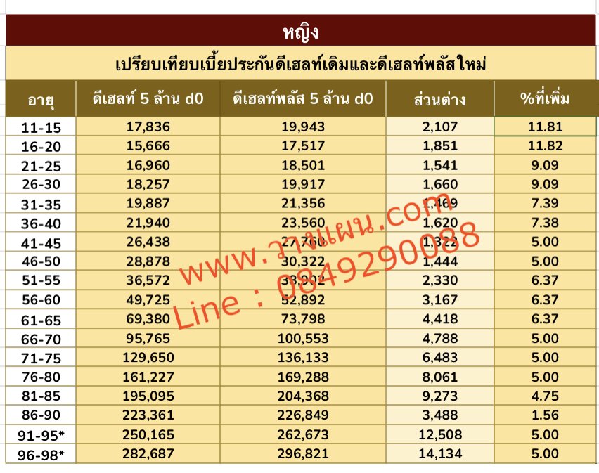 จะเห็นว่า ดีเฮลท์พลัสที่มีความคุ้มครองเพิ่มขึ้นก็มีการเพิ่มเบี้ยในอัตราแต่ละช่วงอายุดังนี้ (หญิงและชาย มีอัตราการเพิ่มเบี้ยใน % ที่เท่ากัน)