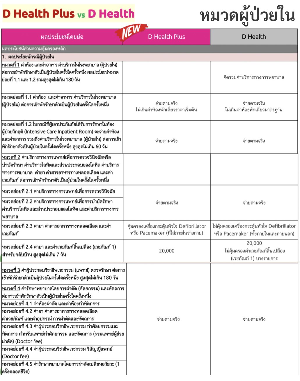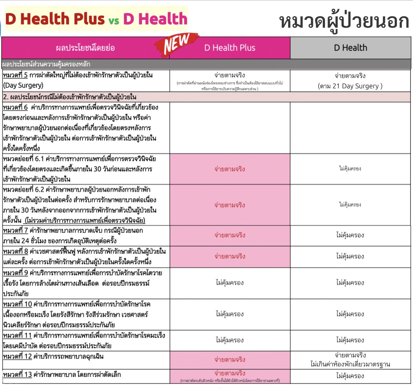 D Health ได้ปิดการขายตั้งแต่ 25 มิถุนายน 2565 และเริ่มเป็น D Health Plus ตั้งแต่ 1 กรกฎาคม 2565 จึงขอเปรียบเทียบทั้ง 2 แบบนี้เพื่อให้ผู้ที่สนใจมีความเข้าใจและผู้ที่มีดีเฮลท์อยู่แล้ว อยากพิจารณาเปลี่ยนแผน โดยทางบริษัท เมืองไทยประกันชีวิต มีโปรโมชั่นในช่วงเปิดตัวแบบประกันดี เฮลท์ พลัส ในไม่กี่เดือนแรกนี้ มอบสิทธิให้ลูกค้าดีเฮลท์เก่า สามารถอัพแผนเป็นดีเฮลท์พลัสใหม่ได้โดยไม่ต้องตรวจสุขภาพและไม่ต้องมีระยะรอคอยใหม่