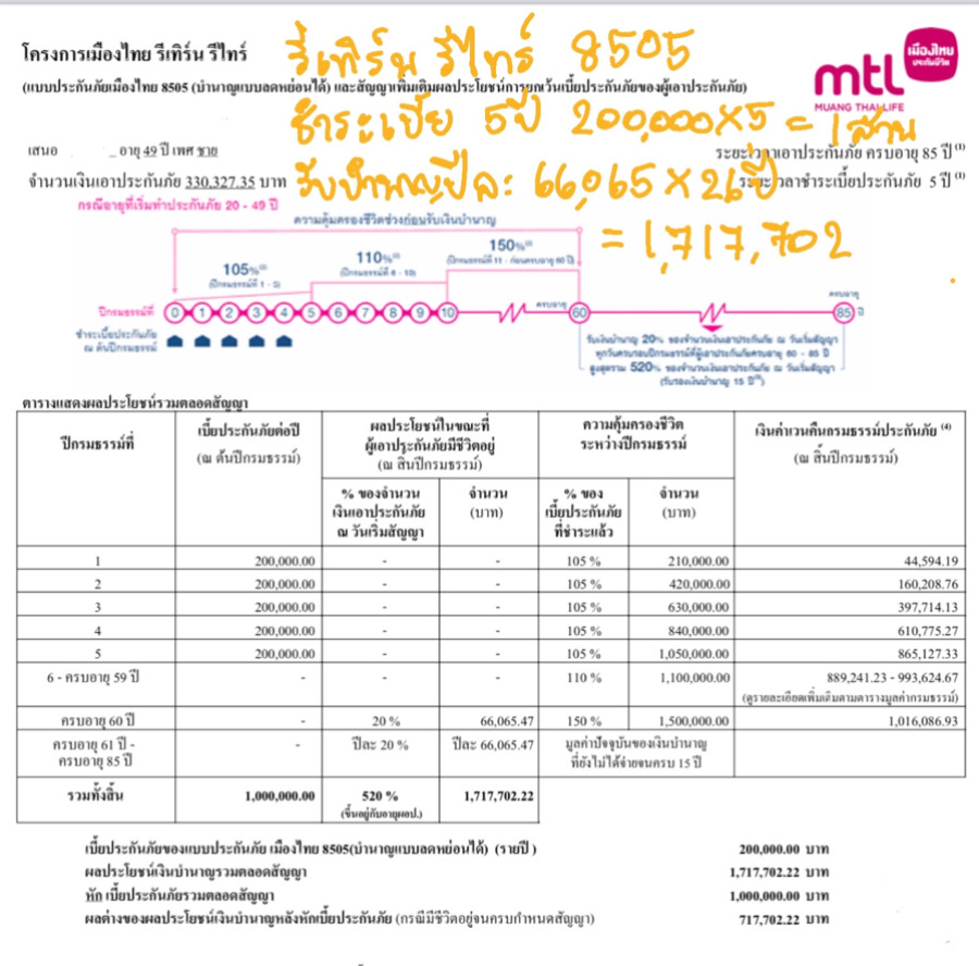 สำหรับชายอายุ 49 ปี ทำประกันบำนาญรีเทิร์น รีไทร์ 8505 แบบเบี้ยปีละ 200,000 สิ่งที่ได้คือ