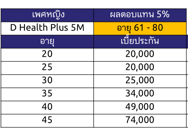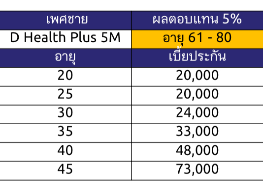 "สำหรับทำประกันสุขภาพ D health plus ให้สุขภาพคุ้มครองถึงอายุ 80 โดยจ่ายตั้งแต่วันนี้ ถึงอายุ 60"
