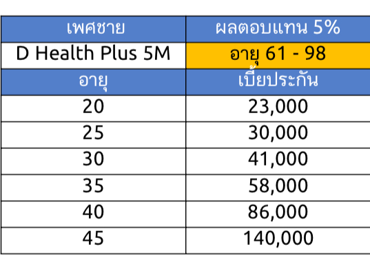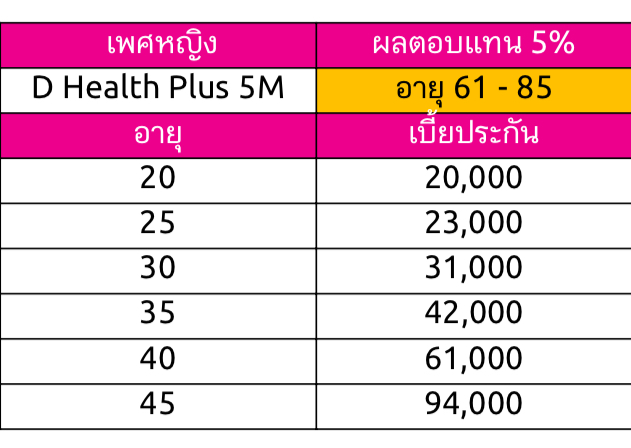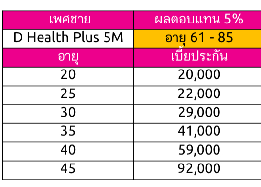 "สำหรับทำประกันสุขภาพ D health plus ให้สุขภาพคุ้มครองถึงอายุ 85 โดยจ่ายตั้งแต่วันนี้ ถึงอายุ 60"