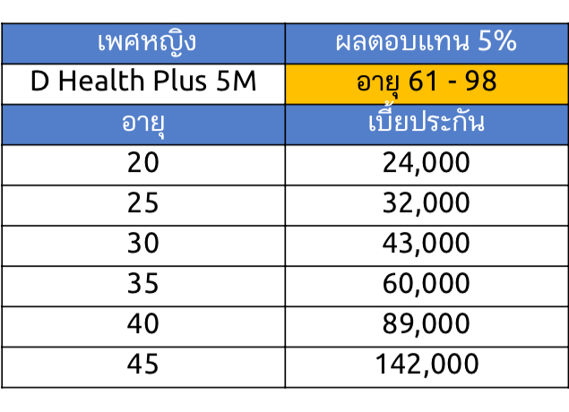 "สำหรับทำประกันสุขภาพ D health plus ให้สุขภาพคุ้มครองถึงอายุ 98 โดยจ่ายตั้งแต่วันนี้ ถึงอายุ 60"