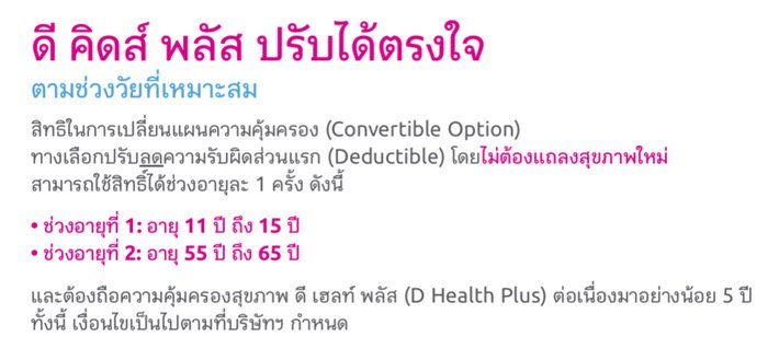 แบบ D Kids Plus นี้สำหรับลูกน้อยอายุไม่เกิน 10 ขวบ หากลูกที่อายุตั้งแต่ 11 ปีขึ้นไป จะเป็นแบบประกันสุขภาพดีคิดส์พลัสสำหรับเด็กโตที่มีชื่อว่า ประกันสุขภาพ D Health Plus ดูรายละเอียดตามลิ้งค์นี้ค่ะ https://www.wangpaan.com/content/11725/d-health