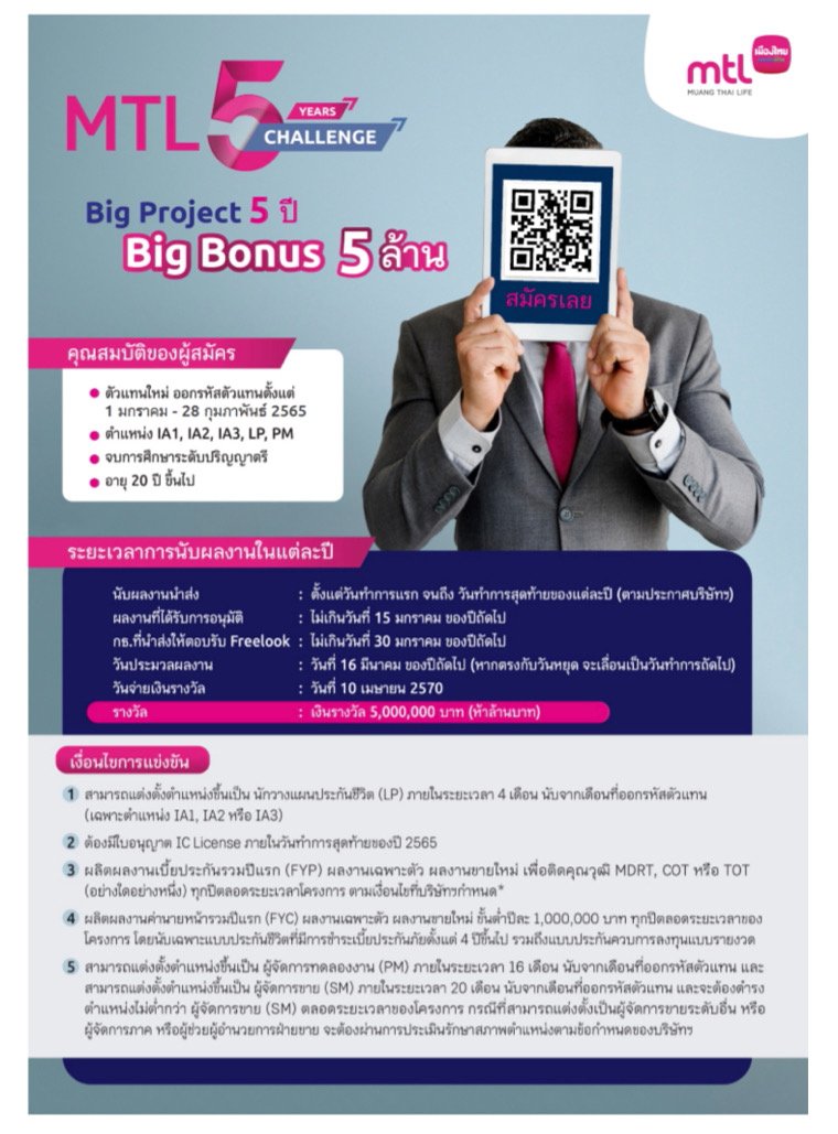 ข่าวดี!!! สำหรับผู้ที่กำลังจะก้าวเข้ามาในอาชีพตัวแทนประกันชีวิต วันนี้วางแผนดอทคอมรับสมัครผู้ร่วมทีมที่จะ Audition เข้าสู่โครงการ MTL 5 YEARS CHALLENGE แบบออนไลน์ Big Project 5 ปี Big Bonus 5 ล้าน
